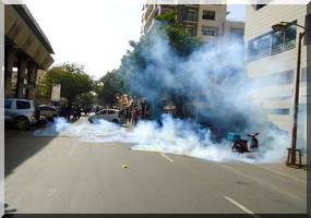 Une centaine de jeunes étaient rassemblés au bout d'une avenue menant à la Place de l'Indépendance et ont jeté des pierres sur des policiers qui leur barraient l'accès et ont riposté à coups de gaz lacrymogènes.